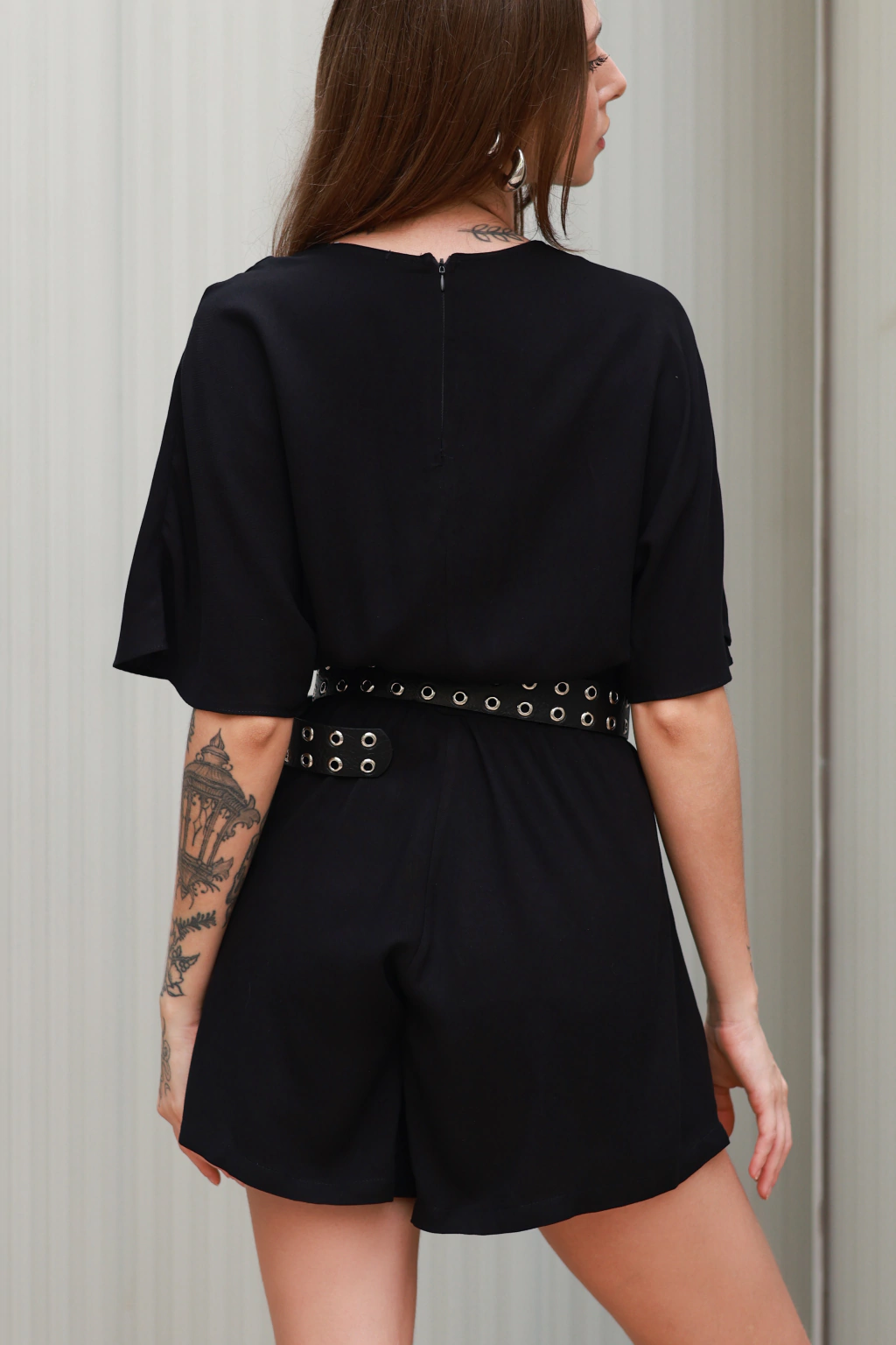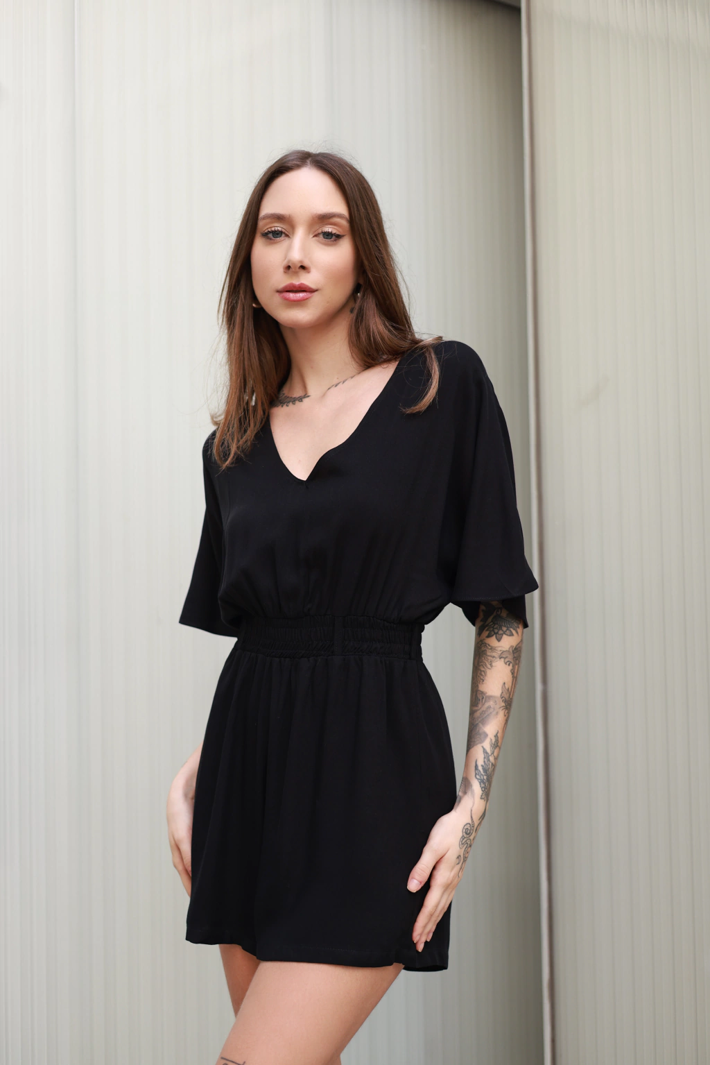 Macacão Curto Chloe Preto em tecido premium, possui elástico na cintura e fechamento nas costas por zíper.