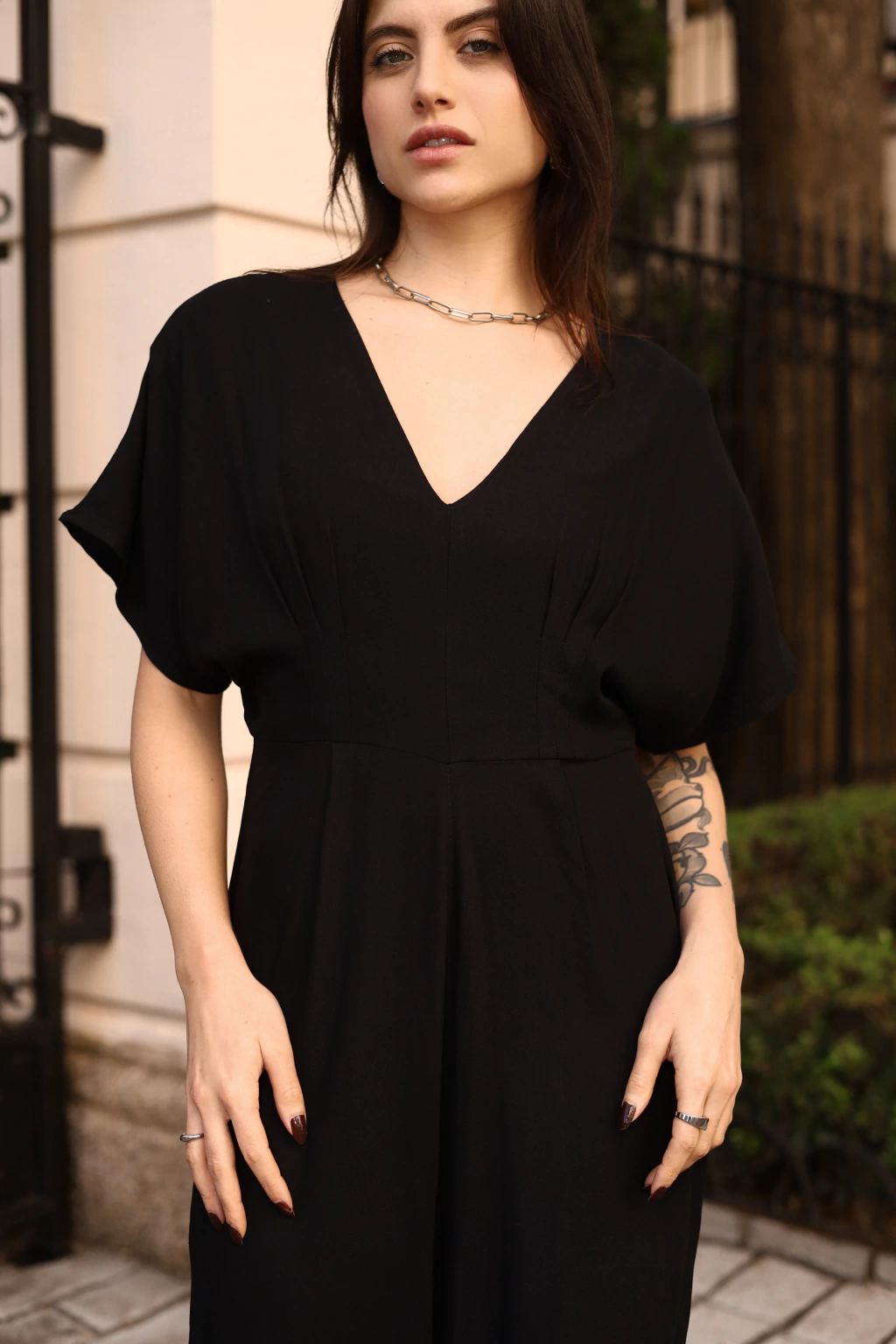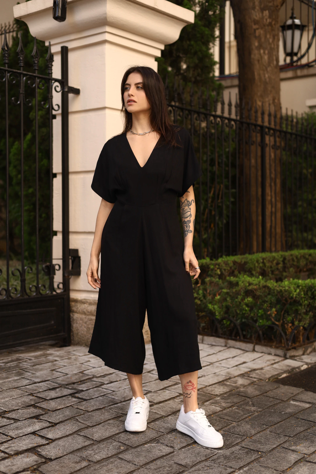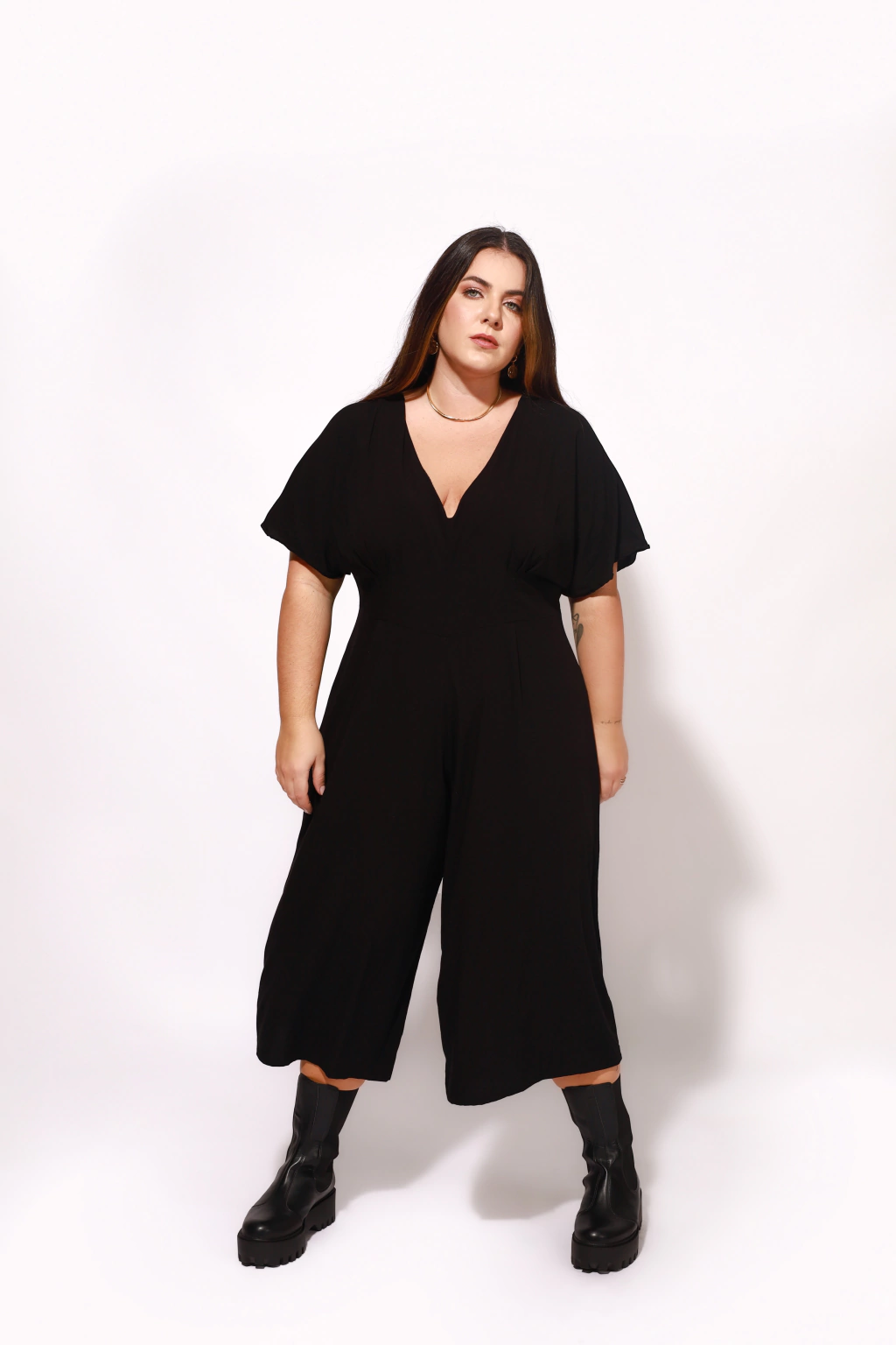 Macacão Pantacourt Sophia Preto em viscose premium com elastano, é acinturado, possui fechamento com zíper e botão na parte das costas.