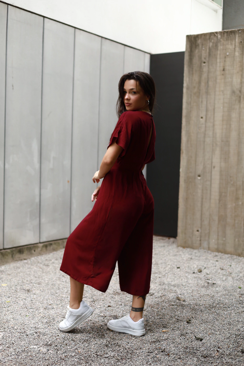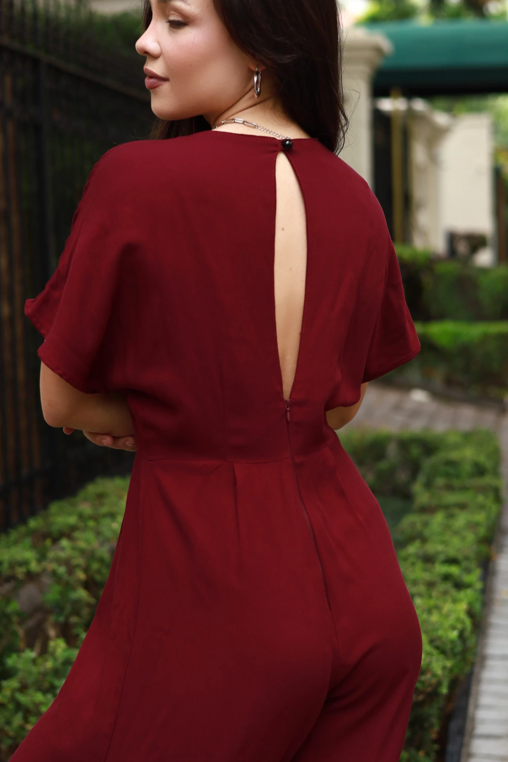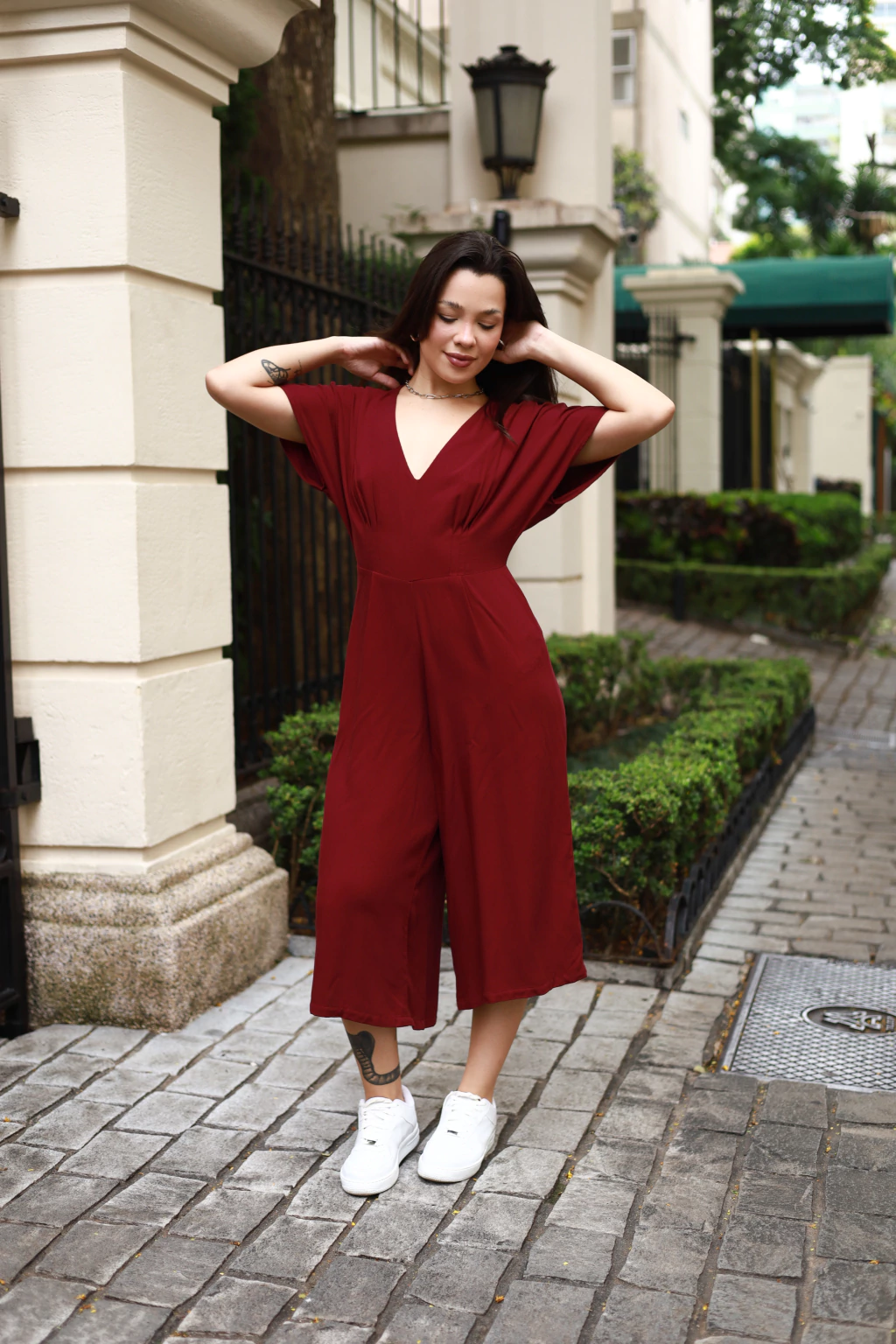 Macacão Pantacourt Sophia Vermelho em viscose premium com elastano, é acinturado, possui fechamento com zíper e botão na parte das costas.