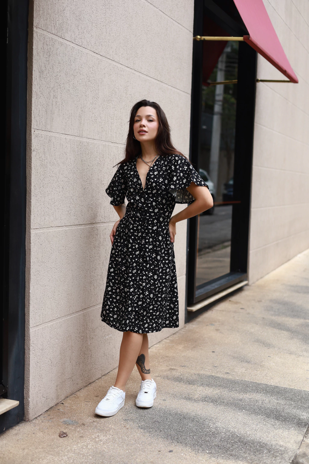 Vestido Lilly Florido em viscose, é acinturadinho, possui fechamento frontal por botões e mangas soltinhas.