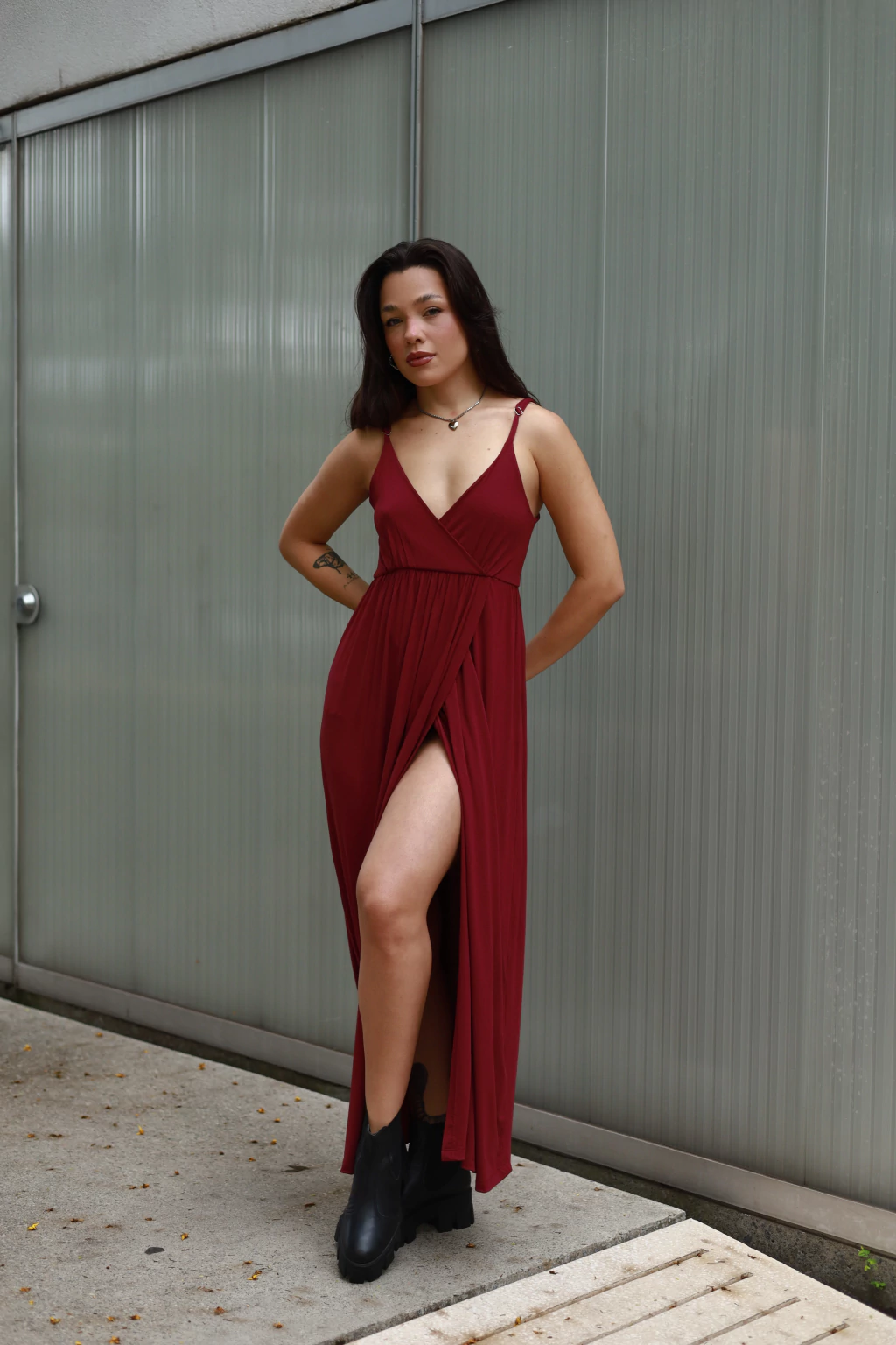 Vestido Longo Mia Vermelho em viscolycra, possui elástico abaixo do decote, fenda e decote transpassados.