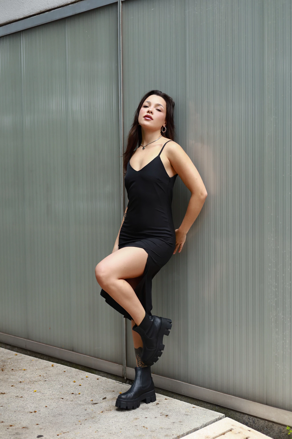 Vestido Midi Catharine Preto 2.0 de crepe, possui forro, regulador nas alças e zíper lateral.