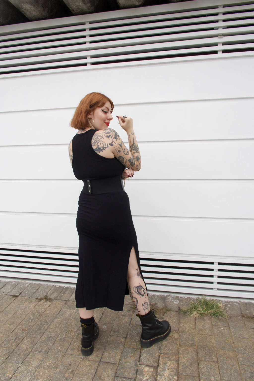 Vestido Midi Gal Preto em malha canelada, se adapta muito bem ao corpo e possui decote cavado.